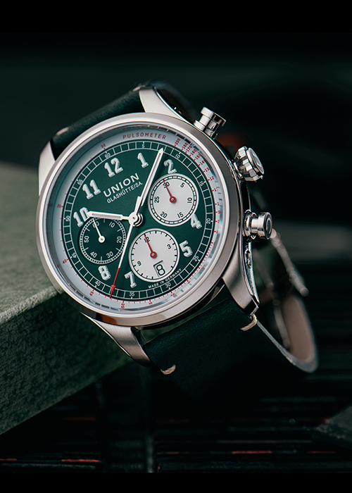 Dieser elegante Chronograph zelebriert 125 Jahre Uhrmacherkunst aus Glashütte. In Anlehnung an die Tradition und das Vermächtnis verfügt die Uhr über ein veredeltes Handaufzugskaliber, welches dem von Taschenuhren nachempfunden ist. Dank des fehlenden Rotors kann es durch einen Glasboden in seiner ganzen Schönheit bewundert werden. Charakteristisch sind die thermisch gebläuten Schrauben, sowie die Platizität und Tiefe des Uhrwerkes aufgrund seiner Architektur. Die Chronographenfunktion ermöglicht das Stoppen von Zeiten. Dargestellt werden diese auf einem weißen Zifferblatt mit roten Akzenten durch ebenfalls thermisch gebläute Zeiger. Eine Eisenbahnminuterie, sowie eingelassene Totalisatoren zeugen von Liebe zum Detail.