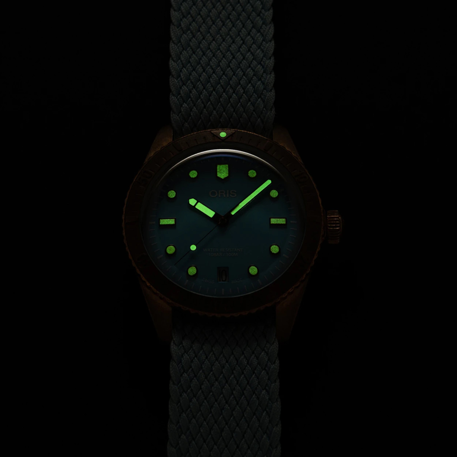 Geschichte der Divers Sixty-Five 'Cotton Candy' Die Divers Sixty-Five 'Cotton Candy' wurde entwickelt, um in schwierigen Zeiten Freude zu bringen und Leichtigkeit zu vermitteln. Inspiriert von den optimistischen Farben des Lebens, kehrt die Kollektion nun mit einem erfrischenden Upgrade zurück: recycelte Perlon-Armbänder in den lebhaften Tönen Himmelblau, Wildgrün und Lippenstiftrosa. Mit ihrem charmanten Design und der nachhaltigen Botschaft setzt sie ein klares Zeichen für Stil und Verantwortung. Gehäuse der Divers Sixty-Five 'Cotton Candy' Das Gehäuse der Uhr besteht aus mehrteiligem Bronze, ergänzt durch eine robuste Bronze-Lünette mit Minutenskala. Das beidseitig gewölbte Saphirglas mit Antireflexbeschichtung auf der Innenseite sorgt für hervorragende Sicht. Der verschraubte Edelstahlboden ist mit einer Spezialgravur versehen. Mit einem Durchmesser von 38 mm ist die Uhr perfekt proportioniert für ein zeitlos elegantes Auftreten. Die Wasserdichtigkeit bis zu 10 bar macht sie auch für den Einsatz im Wasser geeignet. Uhrwerk der Divers Sixty-Five 'Cotton Candy' Die Uhr ist mit dem Kaliber 733 ausgestattet, einem automatischen Uhrwerk, das auf einem zuverlässigen Sellita SW 200-1 basiert. Es bietet eine Gangreserve von 38 Stunden und schlägt mit einer Frequenz von 28.800 Halbschwingungen pro Stunde (4 Hz). Funktionen wie Sekundenstopp, Datumsanzeige und Feinregulierung unterstreichen die technische Raffinesse dieses Zeitmessers. Armband und Zifferblatt der Divers Sixty-Five 'Cotton Candy' Das recycelte Perlonarmband steht für nachhaltige Innovation und ist in drei fröhlichen Farben erhältlich: Himmelblau, Wildgrün und Lippenstiftrosa. Das rote Zifferblatt setzt einen markanten Kontrast und unterstreicht den individuellen Charakter der Uhr. Stunden-, Minuten- und Sekundenzeiger sind präzise und gut lesbar gestaltet. Fazit zur Divers Sixty-Five 'Cotton Candy' Die Divers Sixty-Five 'Cotton Candy' ist mehr als nur eine Taucheruhr – sie ist ein Statement für Optimismus und Umweltbewusstsein. Mit ihrem charmanten Design, ihrer soliden Mechanik und der nachhaltigen Materialwahl ist sie die perfekte Begleitung für alle, die Funktionalität und Stil schätzen.