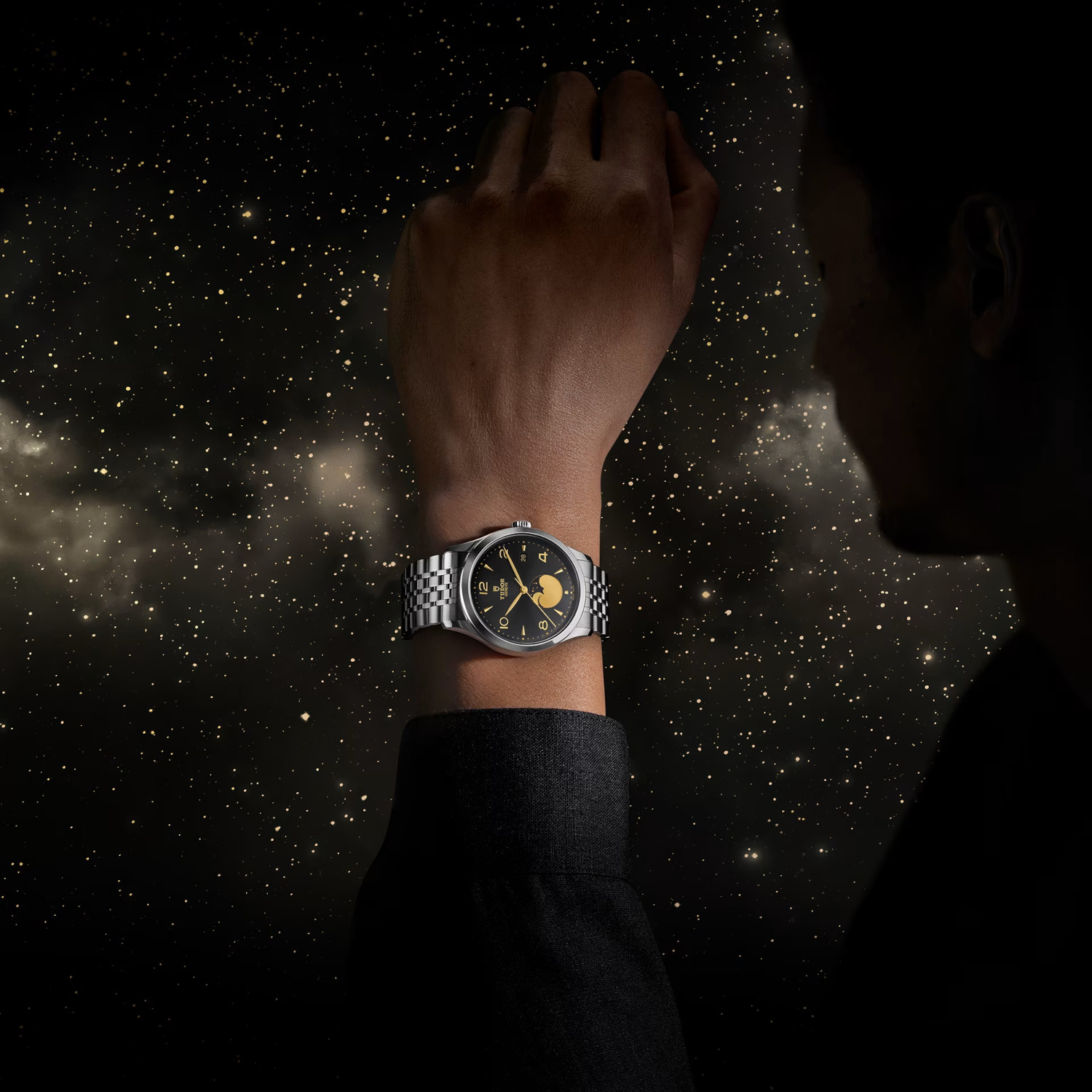 Zum edlen Edelstahlgehäuse passt ein hochwertiges Edelstahlband mit sieben Gliedern, das sich durch satinierte äußere Elemente und polierte Mittelglieder auszeichnet. Dieses Zusammenspiel aus matten und glänzenden Oberflächen verleiht dem Armband einen raffinierten Look und reflektiert das Licht auf elegante Weise – perfekt abgestimmt zum schwarzen Sonnenschliff-Zifferblatt mit Mondphase. Die Bandbreite von 21 mm sorgt für optimalen Tragekomfort und eine attraktive Proportion am Handgelenk. Die Sicherheitsfaltschließe gibt sicheren Halt und ermöglicht eine bequeme Handhabung. Das Armband sorgt mit seiner ergonomischen Gestaltung für angenehmes Tragegefühl über längere Zeiträume und komplettiert das elegante Erscheinungsbild der Uhr.ALTHERR´s Fazit zur schwarzen TUDOR 1926 Luna (Referenz M91560-0003)