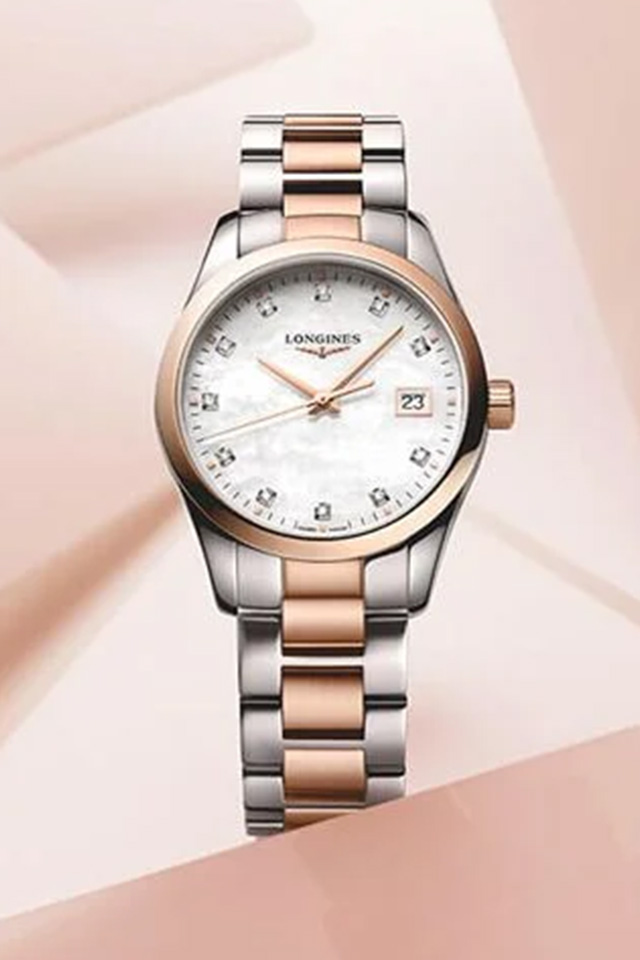 Die Conquest Classic 34 ist wahrlich zeitlos elegant, missachtet aber nicht die sportliche Seite der Kollektion. Abgerundet wird das raffinierte, silberne Zifferblatt durch warme Roségolddarbene Zeiger und Indizes, sowie ein universelles Edelstahlarmband mit Dreifach-Sicherheitsfaltschließe. Die Datumsfunktion trägt zusätzlich zur Alltagstauglichkeit bei.